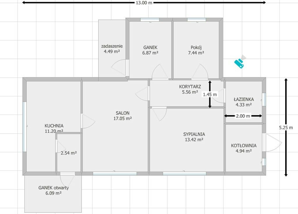 pokoju - blachodachówka. Wysokość pomieszczeń - 2,5m.